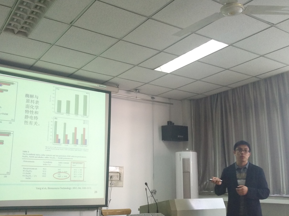 杨明为大家介绍了生物能源的种类及第一代、第二代和第三代生物能源的研究现状,结合自己硕士、博士期间对于第二代生物能源以及生物丁醇生产的不断探索研究,详细讲述了以纤维素和半纤维素替代粮食为原料生产丁醇的生物过程及条件优化,以及取得的突破性进展。杨明的报告既有科学研究的前瞻性,又有广泛的科普性,受到与会师生的欢迎和好评。报告结束后学院师生和杨明进行了交流,科研思想、思路的碰撞感染着会场。